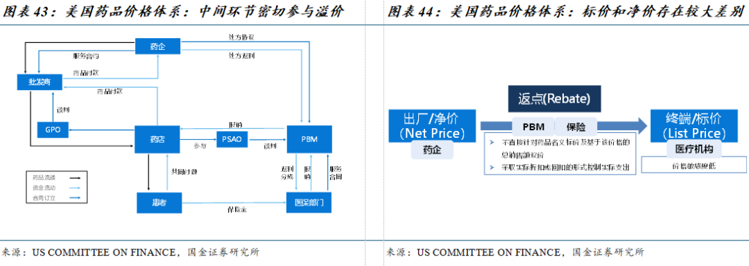 降价幅度相对可控,Net Price谈判主要影响流通环节而非制药企业:①IRA谈判过程中,实际销售中的净价和产品上市时间对结果有较大的影响。谈判过程中,主管部门CMS通过探测谈判药品在市场上扣除折扣返回(Rebate)和其他期间费用后的平均“净”销售价格,并以此为基础,考虑产品已上市时间(上市越久则降价越多)和产品临床价值(临床需求、是否有替代等),来形成医保谈判底价。CMS基于得到的底价,和厂商进行多轮沟通谈判,形成最终药品谈判价格。②由于谈判主要围绕净价格(Net Price)进行,降价更多影响流通环节(如PBM等)、而非制药企业。由于流通环节的存在,美国医药市场中的标价和净价存在较大差别,第一次IRA谈判价格在标价层面下降38-79%(平均63%),但实际净价层面的下降据估算仅约20%。