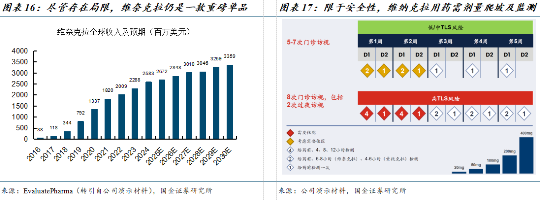 维奈克拉奠定BCL2疗法的应用基础,但有效性、安全性均存在较大的提升空间。目前全球仅有维奈克拉一款BCL2抑制剂获批上市,适应症为CLL/SLL(单药或联合BTK抑制剂/CD20单抗)、AML(联合阿扎胞苷),2024年全球实现销售额约26亿美元(同比+13%)。以维奈克拉为核心的复合治疗方案为CLL提供了固定疗程治疗的选择,奠定了BCL2疗法的应用基础,但目前包含维奈克拉的CLL固定疗程疗效欠佳:受限于维奈克拉本身分子的毒性,患者易出现肿瘤溶解综合征(TLS)等风险,且需经过密集的剂量爬坡及监测过程方可进入稳定治疗,为用药的依从性和便利性带来挑战。