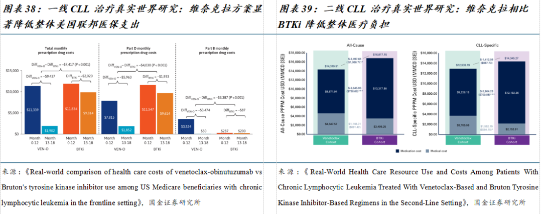 固定周期治疗:若采取BTKi(伊布替尼/阿可替尼获批适应症)+维奈克拉疗法,年治疗费用约38万美元,治疗一年即可停药(参考AMPLIFY研究、GLOW研究,详见上文表18)。尽管首年治疗费用翻倍,但后续多年的治疗费用可大幅节省。