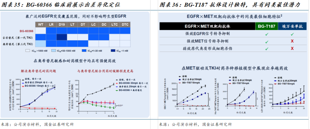 EGFR CDAC有望引领肺癌小分子靶向药迭代,EGFR/MET/MET三抗有望进一步拓展肺癌布局版图。公司研发的EGFR CDAC BG-60366在机制方面具有差异化,对所有典型EGFR突变及主要耐药形式均具有高度效力,且保留了野生型EGFR的活性、蛋白质组学选择性良好,有望解决奥希替尼等三代EGFR-TKI的耐药问题,同时具有与EGFR-TKI的联合用药潜力,公司预计于2025H2开始联合三代EGFR-TKI的临床治疗计划。此外,公司的EGFR/MET/MET三抗BG-T187亦在临床前展示出同类最佳治疗潜力,未来与EGFR CDAC具有联合潜力,其皮下制剂预计于2025Q3进入临床。