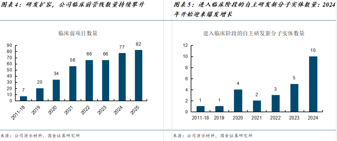 研发规模“高举高打”,带来业内领先的竞争优势。公司开展全球化的临床布局,截至2025年6月,公司团队包括超过1200名研究人员、超过3700名全球开发与医学团队。凭借自主全球临床能力,公司在速度、成本、质量及研究中心覆盖等方面具有业内领先优势,据公司统计,在CDK4抑制剂、EGFR ADC等产品的临床推进中,团队启动GLP毒性研究至Ia期首例患者入组平均用时9.9个月(较业内基准水平快30%),每个剂量递增队列平均用时7.1周(CDK4抑制剂较主要竞争对手入组速度高3倍),确定推荐剂量后启动剂量扩展平均用时4.4周(较业内基准水平快50%以上)。在竞争激烈、研发速度即“生命线”的创新药行业,高效率、全球化的研发团队为公司管线带来各个赛道的身位领先。