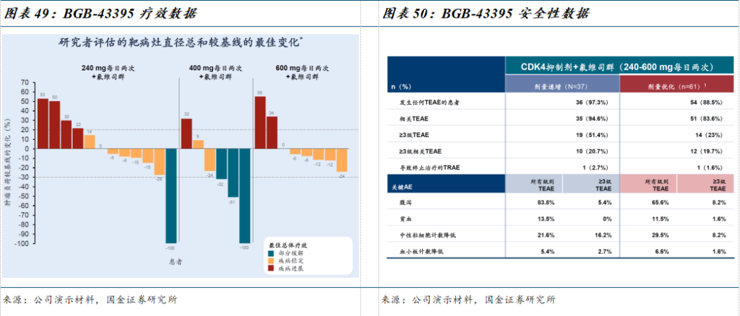 公司的CDK4抑制剂数据已展现初步临床潜力。BGB-43395在既往接受过多线治疗的剂量递增患者中观察到初步抗肿瘤活性,在中位随访时间仅3个月、2.7个月的情况下在乳腺癌、所有患者(乳腺癌、子宫内膜癌、卵巢癌)中观察到ORR分别为11%、15%,考虑到随访时间仍较短、部分患者仍存在剂量爬坡,未来响应率数据有望进一步提高。安全性方面,BGB-43395观察到的腹泻为低级别事件且可控,无腹泻导致的治疗终止,且观察到潜在同类最佳血液学安全性特征。
