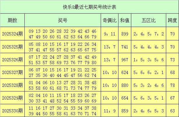 福彩快乐8第2025330期开出奖号:11 16 17 27 30 31 33 34 37 38 39 44 50 55 58 61 63 70 71 74,其中奖号奇偶比为11:9,和值为859,跨度63,五区比为2:4:6:5:3。